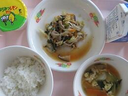 今月の好き嫌い克服のポイントは「きのこ」です。きょうは,チャーシャン豆腐に「しいたけ」,春雨スープに「えのき」が入っています。きのこは食物繊維が豊富で腸の働きを活発にしてくれます。また,噛み応えがあるので,噛む力を付けるにも最適です。最近ではハウス栽培をして1年中食べることができますが,秋が旬の食材です。