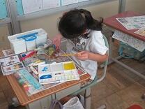4年生の図画工作の授業です。図工室で活動していました。「つくって,つかって,たのしんで」がテーマで,子供たちは,のこぎりを使って板材を切り,切り取った板を組み合わせて作品をつくってるようです。ある子は「小物入れ」をつくっていました。絵具で色付けをしていますが,紫や青など,グラデーションをつけて塗っていました。雰囲気のある「小物入れ」に仕上がりそうです。
