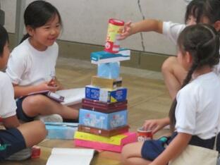 きょうのメインは「グループで動きを考えてものがたりをつくる」ことです。子供たちは,自分たちの「〇〇ランド」に合った生き物などを登場させ,色々な動きを考えていました。あるグループは,草に上っているテントウムシが敵に襲われたときに,パット飛び立つ様子を表現していました。どのグループも友達と話し合いながら,楽しく踊ったり撮影したりしていました。