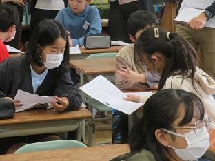 6年生の家庭科の授業です。テーマは「1食分の献立を考える」です。きょうは,栄養教諭の先生が来室して,給食の献立の立て方について説明をしています。子供たちも真剣に聞き,メモをしっかり取っている様子が見られました。「おもしろいね」と,友達に語り掛ける場面も見られるなど,興味をもって話を聞く姿勢がうかがえます。主食,主菜,副菜をどのような順番で決めていくか,栄養のバランスをどのように考えているか,宇都宮市ではどんな取組をしているか,子供たちにおいしく食べてもらうためにどんな工夫をしているかなどについて,丁寧に分かりやすく話をしてくれました。給食では,旬の食材を積極的に取り入れたり,地域の方との関わりを意識したり,郷土料理や行事食,学校行事と関連付けて「食」への関心を高めたりするなど,様々な面で「食育」を意識し子供たちの成長を考えています。授業の終末には「献立の立て方の工夫が分かった。家でも家族で一緒に献立を考えいきたい」「工夫や苦労が分かった。自分が献立を作るときにも参考にしていきたい。」といった子供たちの振り返りも聞こえてきました。次時には,いよいよ自分で献立を立てていきます。子供たちがどんな献立を考えるか楽しみです。