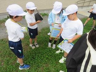 2年生の子供たちが,生活科の授業で秋を探しに校庭に出てきました。今年は暑い日が続き,季節がなかなか進まない様子で,自然の変化を見付けるのも大変そうです。それでも子供たちは大きな松ぼっくりを拾ってきたり,バッタやカマキリを見付けたりしていました。よく見ると木々の葉も少しずつ色づいていることに気付きます。子供たちは写真に撮ったり,気付いたことをメモしたりして自然の変化を探していました。