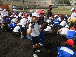 学校農園では,学年ごとに「いもほり」が始まっています。きょうは,4年生と6年生です。大きなお芋がいっぱいとれました。子供たちもびっくりです。「先生!見て!」と芋を持ち上げて満面の笑顔を見せてくれます。友達といっしょに力を合わせて周りの土を掘り進めました。「もうすこし!もうすこし!」「とれたあ!」子供たちも楽しそうです。今年も貴重な体験を子供たちに与えてくださった地域の方に感謝です。