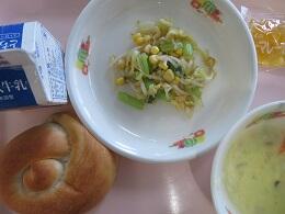 給食室からきょうの給食の献立をお知らせします。きょうは,コッペパン,牛乳,セルフ焼きそばサンド,豆腐入りかきたま汁,揚げシュウマイです。