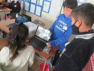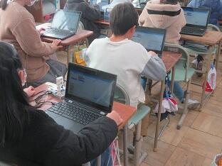 5年生の社会科では,「あたたかい土地のくらし」で沖縄県の自然や人々の生活,産業等について学習しました。このクラスでは学習したことを基に沖縄をPRするポスターを作成しています。タブレットを用いて作成しているようですが,作品を見ると,今と昔の違いや特産物,観光資源などをテーマとした内容が見られます。ある子に聞いてみると,「絵や文章を友達と分担して作っています」と,友達と交流しながら活動していることも分かりました。