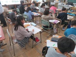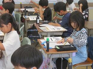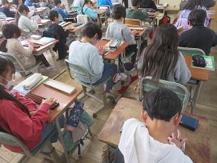 5年生の書写の時間です。きょうは毛筆の練習で「ふるさと」と書いています。穂先の動きと点画のつながりを意識して書きます。筆を立たせ,穂先に意識を集中させている子供たちの様子が見られます。一人一人が半紙に向き合い文字に集中しているので,教室は静寂に包まれています。