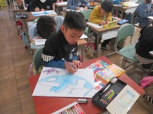 1年生の図画工作の時間です。題材名は「チョッキンパッでかざろう」です。ここでは,紙を折ったり切ったりして開いてできる模様を楽しみながらデザインします。子供たちは,折り紙を四角に折ったり三角に折ったり,折る回数も2回,3回と増やしていったりしながら試しています。切り込みを大きく入れたり,小さく入れたりして,丸や四角など,色々な形を切り取って,開いてできる模様を楽しんでいます。何枚かできあがると,それらを画用紙に貼っていくようです。ここでも,向きを変えたり,紙を重ねたりしながら工夫してデザインを広めていきます。楽しいデザインができあがりそうです。