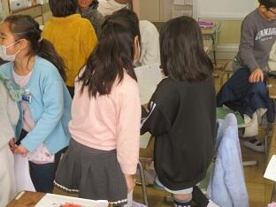 こちらからも子供たちに聞いてみました。「どんな教科の学習が好きですか?」子供たちからは,体育や図画工作,生活科,算数,国語など,たくさんの教科の回答がありました。「私は図工が好きです。自分が作るのも楽しいけど,友達の作品を色々と見て回るもの楽しいです。」「ぼくは,算数では計算が得意です。先生が計算の仕方を分かりやすく教えてくれるので好きになりました。」・・・。子供たちからも色々な話を聞くことができ,楽しい時間になりました。