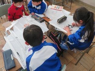 5年生の外国語の授業です。きょうは,子供たちがAlphabetに真剣に向き合っています。テーマは「町内の場所(町の中にある色々な建物)」です。ワークシートを使って「パン屋」「銀行」「病院」などの英単語を探していきます。探す建物の単語は大文字と小文字で表記されていますが,ワークシートには大文字のAlphabetのみがランダムに表示されているので,小文字から大文字に変換して探す必要があります。また,「スーパーマーケット」などの長めの単語を探すのはちょっと大変そうです。「エス,ユー,ピー,イー・・・」と小声でつぶやいたり,小文字を大文字に変換してメモを取ったりしながら見付けています。暫くすると「いくつ見つかった?」「ショッピングセンターってどこ?」と友達同士,情報交換が始まりました。中には「sports centerを教えるから,supermarketを教えて・・」と交換条件を出す子もいます。授業の終わりごろに,やっと数人「できた!」という声が上がりました。文字を探しながら自然にAlphabetに親しんでいました。