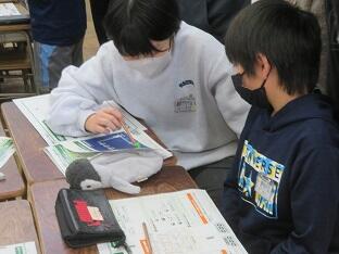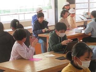 4年生がプログラミングに取り組んでいます。信号機の模型を使って,赤信号,青信号,点滅,音を鳴らす等を指示どおりに作動させるプログラムを作ります。子供たちは,グループになって説明書を読み解きながら端末を操作しています。「分からないよー」という声も聞こえてきますが,近くの子がすぐに助けに来ます。説明書と画面を見比べて友達と一緒に確認をしています。子供たちは,ヒントになる資料があるとどんどん自分たちで作業を進めることができます。友達と相談したり教え合ったりできるのもこの活動のいいところです。