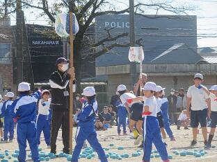 1年生が先日描いた凧を上げています。晴天の下,適度な風が吹いて「たこ」が上がりやすい環境となっています。子供たちは,走りながら夢中になって「たこあげ」をしているので,体もだんだん温まってくるようです。「上がった!上がった!」と笑顔で走り抜けていく子供たちは元気いっぱいでした。虹の絵や笑顔の絵,大きなボールの絵など,大空に…とまではいきませんが,子供たちはとても楽しそうです。友達に「たこ」を持ってもらって準備をしたり,糸が絡まないように注意したりと,体験を通して学んでいることが色々とあるようです。最近では,お正月に「たこあげ」をする風景も見かけなくなりました。ちょっとの時間ですが,昔遊びの楽しさにも少し触れられたような気がします。