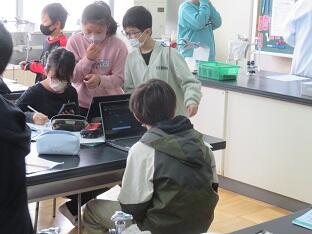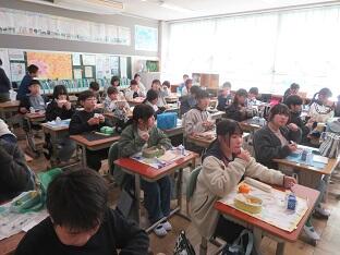 家庭科室からとてもいい匂いがしてきます。このクラスでも最後の調理実習が始まりました。ジャーマンポテト,オムレツ,肉じゃがといったメニューが考えられているようです。どのグループもとてもおいしそうです。それに楽しそう。「家でも料理するの?」と聞いてみると,「少し・・・」とうなずきながら答えが返ってきました。料理をするのは楽しいと話します。学校で友達と一緒に調理するのは,会話も弾んで家庭とはまた違った楽しさを味わっていることでしょう。