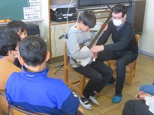 2年生が,手作りおもちゃで1年生と一緒に遊んでいます。「割りばしでっぽう」や「カタコト車」,「ピョンピョンバッタ」など,楽しそうなおもちゃが並んでいます。1年生は,ちょっぴり緊張しながらも,よく2年生の説明に耳を傾けています。1年生に楽しんでもらうためのおもちゃを考えて,分かりやすく遊び方を説明をしたり使い方を示してあげたりと,1年生のことを考えて対応していくことが,2年生にとってのここでの学習の目的の1つになります。1年生は,この経験をもとに,来年の1年生のためにきっと頑張ってくれることでしょう。