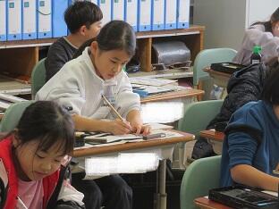 3年生は「人物の気持ちを表す言葉」をテーマに授業に取り組んでいました。子供たちは,これまでに「うれしい」「楽しい」「悔しい」「悲しい」の気持ちをより詳しく表す言葉を集めてきたようです。それらの表現を使って,自分の日記をより詳しく,より気持ちが伝わるように書き換えていきます。さらに,「このときの気持ちをもっと詳しく知りたいな」などと,友達にアドバイスをもらうことで,文章を膨らませていきました。子供たちは,言葉のもつ意味と使い方に対して興味を深めていきました。授業後には「場面によって使い分けていきたい」「1分間スピーチで生かしていきたい」といった振り返りが見られました。