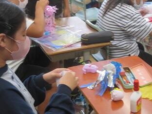 1年生の図画工作の授業です。テーマは「ふわふわ ゴー」です。風で動くおもちゃを作っています。子供たちは,持参した容器を使って,色を塗ったり,色紙を切り取って貼ったりしておもちゃを作っています。どんな形にしたら風を受けてよく動いてくれるのでしょう?そんなことも考えながらデザインしています。「ここを塗るのが難しいなあ」という子も。いろいろと経験しながら学んでいきます。ハサミを上手に使って材料を切り取っている子もいます。中学生も見守ってくれています。完成してみんなで遊ぶのが楽しみですね。