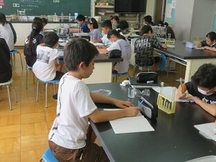 5年生の理科の授業です。テーマは「流れる水のはたらき」です。子供たちは,これまでに川の上流・中流・下流,それぞれ,流れる水のはたらきにはどのようなものがあるかを予想しています。子供たちのワークシートには,「けずる」「ほる」「ながす」「ためる」などの言葉が見られます。きょうは,実験装置と映像からその予想を確かめていく学習となりました。実験を観察する子供たちからは,「あ,けずれてる。」といった言葉も聞こえてきました。なかなか,実際の様子を確認するのは難しい内容ですが,しっかりと整理して理解を深めてほしいところです。