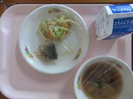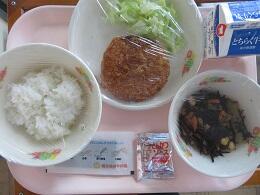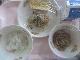 きょうの給食は,麦入りご飯,牛乳,鶏肉と大豆のみそ炒め,けんちん汁です。
