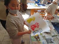 デコボコのある様々な材料を集めて思い思いの形をつくり,ローラーで色を付けて紙に写し取っています。もとになる形は,出来上がりをイメージしながらデザインを考えました。しっかりインクを付けて紙に写します。部分的に色を変えたり,何回か写し取ったりして,カラフルな作品に仕上げています。友達同士,見せ合いながら作品づくりを楽しんでいます。色を上手に写し取るのが難しいですが,子供たちは一生懸命に取り組みました。