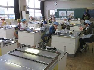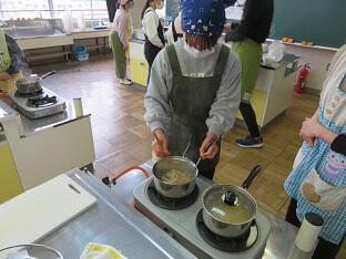 「みそ汁をつくろう」がテーマです。感染症対策として人数を半分にして実施しています。学校栄養職員の先生も応援に来てくれました。子供たちは,手順を確認した後,ペアで協力しながら作っていきます。煮干しの下処理をして,火加減に気を付けながら出汁を取り,具材を切って鍋に入れ,みそを溶かしていきます。子供たちの調理が進むごとに,煮干しのいい匂いやネギの香りがうっすらと漂ってきます。