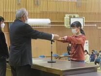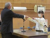 表彰に続いて修了式を行いました。各学年の代表児童に修了証を渡しました。皆,堂々とした態度で受け取っています。次に1年生と5年生の代表児童が作文を発表しました。学習や生活について,1年間を振り返って頑張ったことや成長したと思えることなどについての発表を聞くことができました。