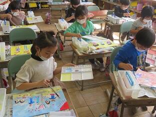 1年生の教室をのぞいてみると,子供たちが絵を描いていました。1年間の思い出を絵に表しているようです。運動会やアサガオを育てたことなど,色々な場面が子供たちの心に残っているようですね。どの子も,集中して画用紙に筆を走らせている姿が印象的でした。