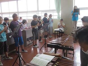 6年生の合奏の様子です。「マルセリーノの歌」を合奏していました。ピアノや鍵盤ハーモニカ,鉄琴,木琴,リコーダーなど,色々な楽器を使って演奏しています。メロディーを中心に,それぞれの楽器の音色が調和して音楽室にきれいに響きます。この演奏のために,子供たちそれぞれに練習を重ねてきたことが分かります。クラス全体での合奏は,友達同士で楽器の音色を聴き合い,バランスを考え感じながら演奏することになります。心を1つにする大切な活動の1つです。