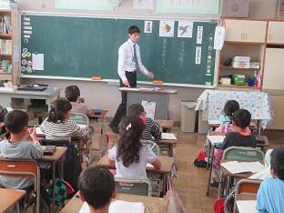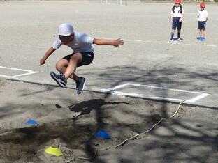 走り幅跳びの練習が始まりました。助走の距離を短くして,次から次に跳んでいきます。「片足で踏み切って両足で着地をする」と,ポイントを押さえて練習します。また,前の人がコースを離れてから助走に入ること,子供たちも先生の注意をしっかり聴いて練習に励みました。運動量が多く,意欲的に練習に励む子供たちの姿が見られました。