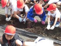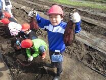 1年生がいもほりをしました。子供たちは,一生懸命に土を掘りながらサツマイモを探します。大きな”おいも”が顔を出すとさらに熱が入ります。やがて,いろいろなところから「とれたあ!」と元気な声が上がりました。大きな”おいも”を手にして笑顔があちらこちらに見られます。