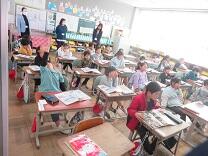 この時間は1年生4クラスが道徳の授業をしています。それぞれ,担任の先生は他の学級で授業をしています。本校では,道徳の授業については,授業者を学年でローテーションしながら取り組んでいます。これによって,各担任の先生は,学年の子供たち全員に授業で対応する機会をもつことになり,児童一人一人のよさを多角的に見取ることができます。また,先生にとっても児童理解が深まり, 先生が連携して「学年の児童」を指導,支援していく意識が高まります。