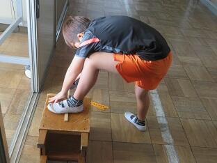 先日は,のこぎりを扱っている様子を紹介しましたが,きょうのこのクラスは,釘打ちをしています。材料を切り取って,細かい部品を釘で接合しています。まっすぐにくぎを打つのは難しそうです。失敗して釘を抜いてやり直す子も出てきました。何事も経験です。経験しながら金づちの使い方も覚えていくことでしょう。細かい部品を取り付けられた子は色塗りを始めています。いよいよ完成間近ですね。