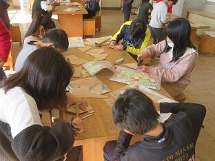 活動の様子を見ていると,いろいろな子供たちの姿を見ることができます。一人で黙々と作業をする子,友達と教え合ったり見せ合ったりしながら作業をする子など,さまざまです。「下書きを消してから貼ったほうがきれいだよ。」「そうか。そうするね。」という会話も聞こえてくれば,「先生,ここ,くっつくまでおさえてて・・・」「え!先生はみんなの様子を見に行くからここにはいられないよ。おもしをのせればいいんじゃない?」というような子もいます。「えーと,おもし,ないかなあ?」と探し出します。何事も経験です。