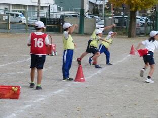 午後2時を過ぎて,日も陰り吹く風も冷たく感じられます。そのような中,校庭から「ガンバレー!」「ハイ!ハイ!」「〇〇さん,こっち!」などと元気な子供たちの声が響いてきました。4年生の体育の授業「フラッグフットボール」です。このクラスでは,互いの陣地のエンドラインに駆け込んで点数を競い合うゲームのようです。腰に挟んだフラッグを取られると,その場から後方にいるチームメイトにパスをしなくてはなりません。ボールを持っていない人の動きにも工夫が必要ですね。たくさんの子供たちから声が出ています。応援にも熱が入ります。寒さに負けない元気な子供たちです。
