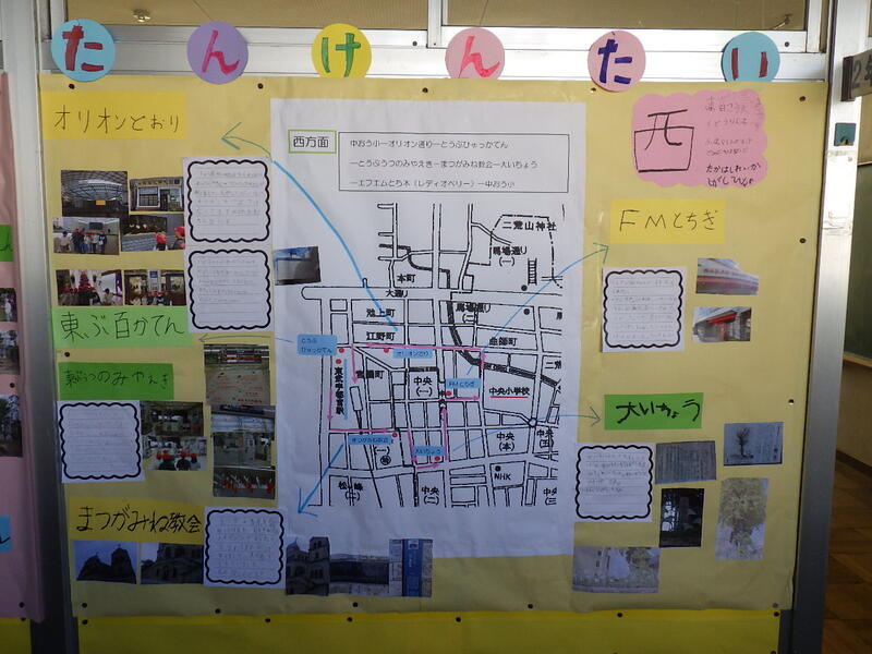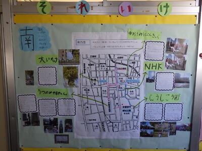 グループごとに、学校の北東部、南部、そして西部に分かれ、建物や施設の様子を調べ、その結果を地図や写真、コメントなどを使ってまとめました。