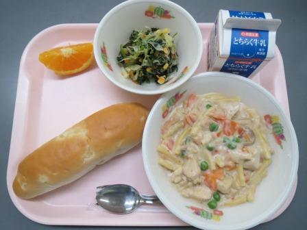 パインパン、牛乳、マカロニのクリーム煮、ゆで野菜、オレンジ
