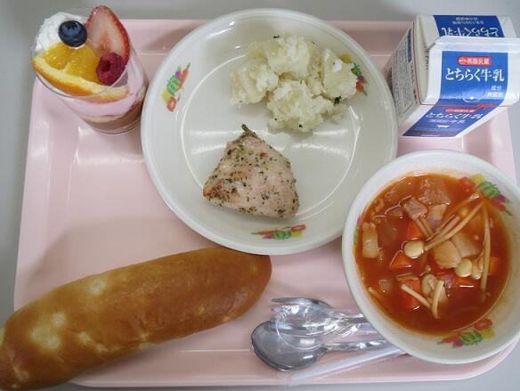 パインパン,牛乳,鶏肉のバジルソテー,粉吹き芋,ミネストローネ,デザート