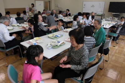 地域の高齢者の方たちと一緒に美味しい給食を食べたり,「おちゃらかほい」の手遊びをしたりして,楽しいひとときを過ごしました。