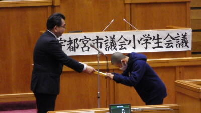 次に議会体験。シナリオに沿って役割を分担し「中央わくわく公園 建設費用」について審議しました。