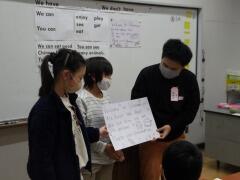 【英語科の授業,外国の人たちに,宇都宮の良さを英語で伝える授業です。左の写真のグループは,城址公園を,右の写真のグループは,中央小学校でもおなじみの紅茶をテーマに英語で紹介していました。今,小学校の英語科は実に高度な学習を行っています。】 《11/26(木) 2校時撮影》