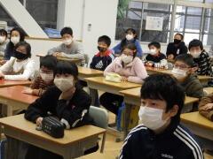 【青木先生の話を真剣に聴いている4~6年生の子供たち】