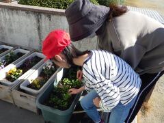 【国旗掲揚塔の前で育てている冬野菜のお世話をしています。「美味しくな~れ!」と願いを込めながら水やりや芽かきをしています。】    《12/8(火)  3校時撮影》
