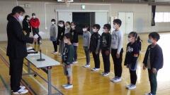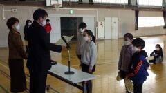業間活動の時間に,体育館で関係児童たちを集めて表彰朝会を行いました。