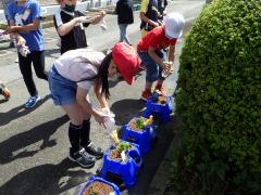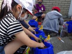 昨日の2年生の野菜の苗植えに続き,今日は1年生がアサガオの種まきを行いました。担任の先生から作業手順をしっかりと教わり,友達と協力しながら手順通りに種まきができました。