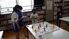 【5/7業間時の図書室の様子。図書委員会企画の「わなげDEぶんるい」に挑戦中です。】
