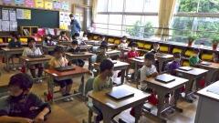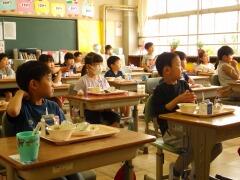 【食べるのも忘れ,テレビ画面を見つめる1年生の子供たち】