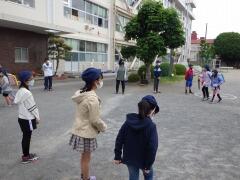 【理科:「地面を流れる水のゆくえ」の単元で,校庭の傾きをお盆の上のビー玉の転がり方で調べていました。前夜に降った雨水の流れた跡を観察している児童もいました。】 《5/26 (水) 2校時撮影》