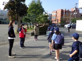 【班ごとに整列し,先生から遠足の概要について説明を聞きます】