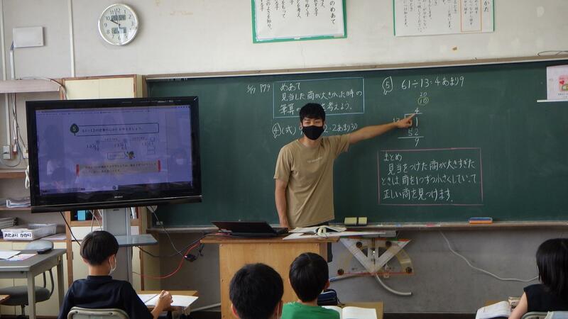 4年生は「わり算」です。(2けた)÷(2けた)の計算の仕方を考える授業で,答えの立て方に焦点をあて,どのように商を立てればよいかみんなで考えました。担任と学力向上担当教員が連携・協力し,分かりやすく授業を展開していました。