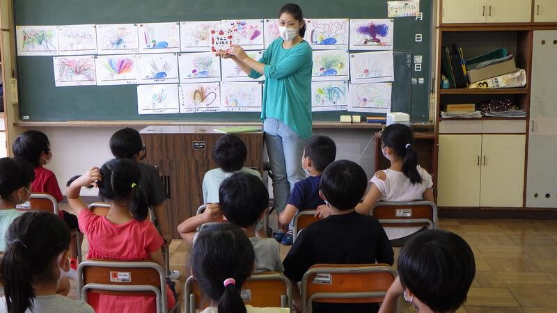 1年生の授業は「さわってかくのきもちいい!」です。液体粘土に絵の具を混ぜてきれいな色を作り,指や手のひらを使いながら思いのままに自分の形を表現しました。そして,自分の作品のよさや友達の表現のおもしろさなどを楽しく話し合っていました。