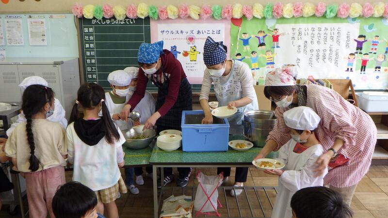 今日から1年生の給食が始まりました。小学校では,自分たちで給食を運び,自分たちの力で配膳し,自分たちできちんと後片付けをします。今日が1年生にとって初めての給食となりましたが,子供たちは先生の指示に従いながら上手に配膳することができました。そして,「いただきます」をするとカレーライスを美味しそうにほおばってました。
