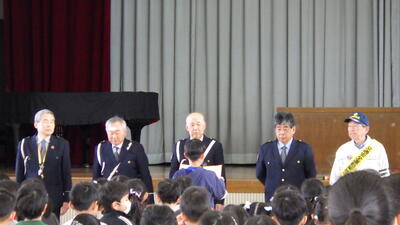 15日(火)の朝,体育館で「交通指導員さんをご紹介する会」を行いました。