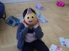 【夕顔の実に目や口を切り抜いてもらい,絵の具を使って着色します】